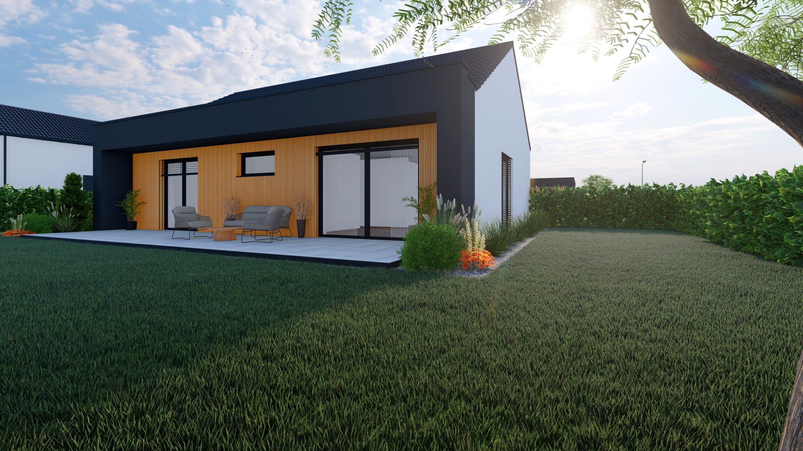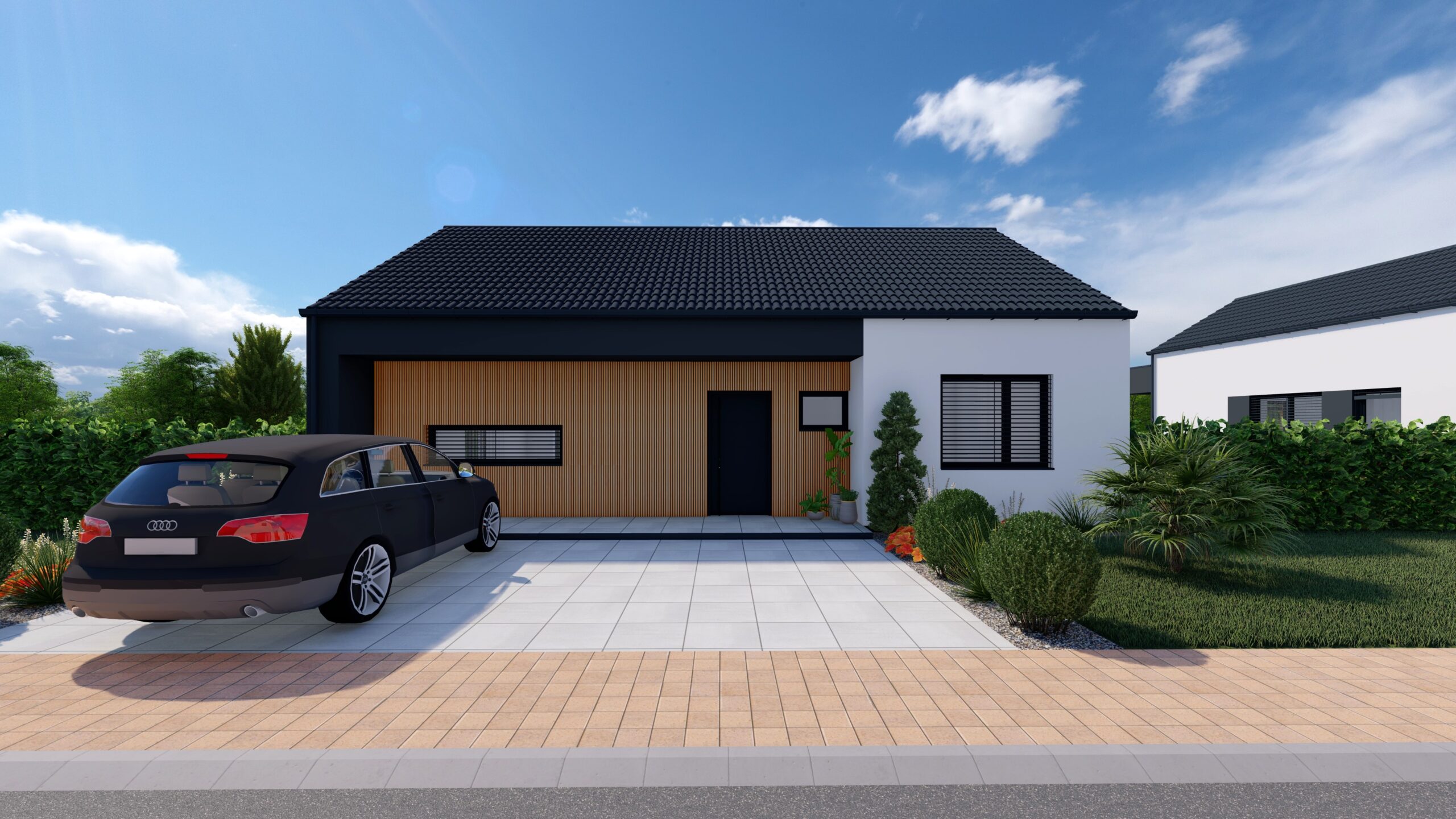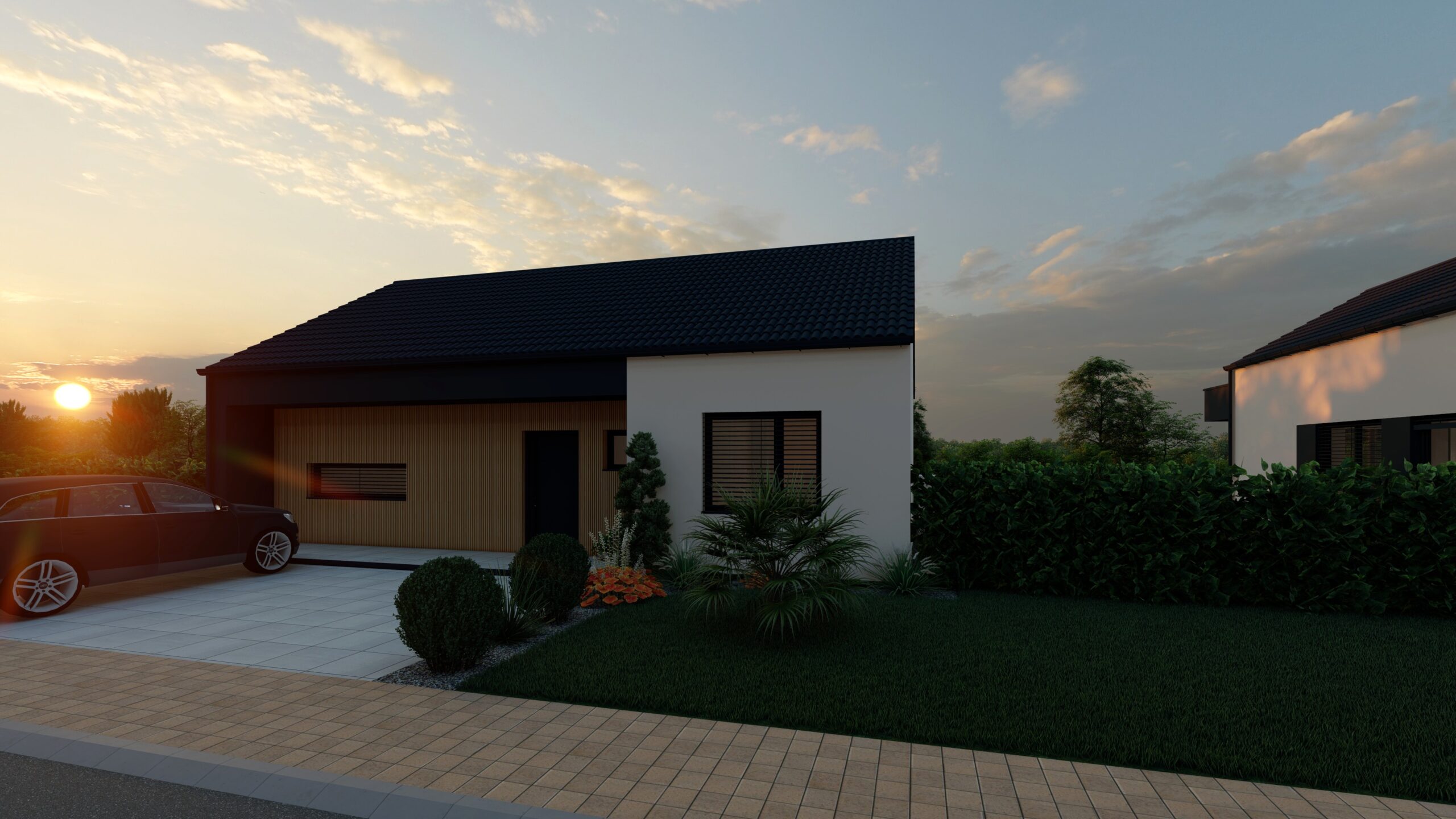 - Cena obsahuje drevené odtienenie terasy, oplotenie plotovými 3D panelmi s podhrabovou doskou, spevnené plochy- zámková dlažba vjazdu a stojiska nádob, dlažba terasy