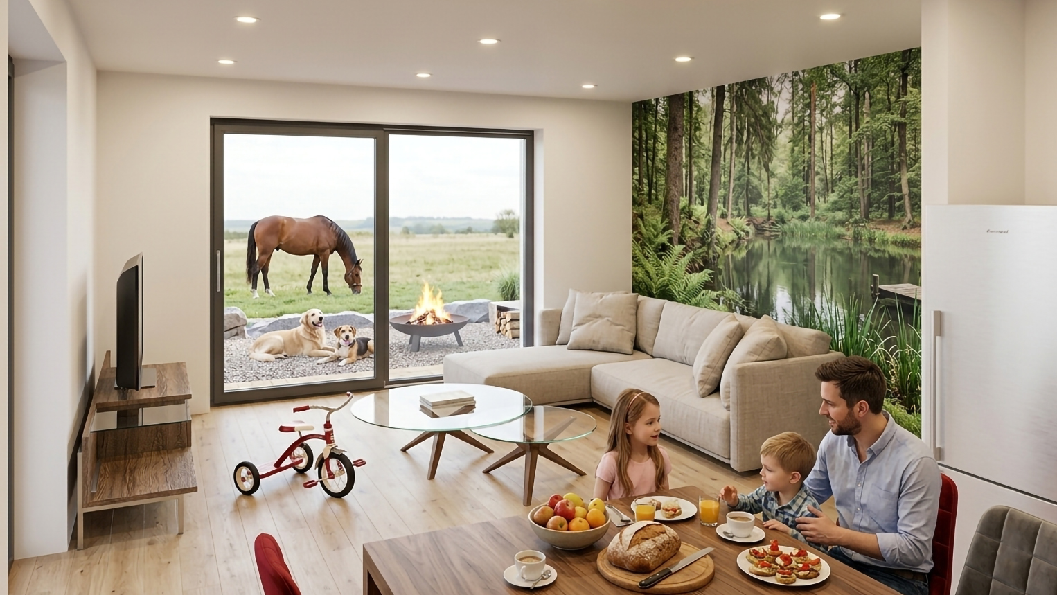 V obývačke sú panoramatické okná s priamym výstupom na prekrytú terasu s výhľadom do otvoreného priestoru.
